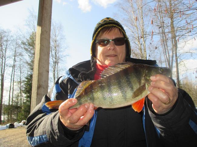 Kilpailun suurimman kalan (ahven, 630 g) pilkki Maritta Pulli. (Kuva: Kimmo Hyvärinen)