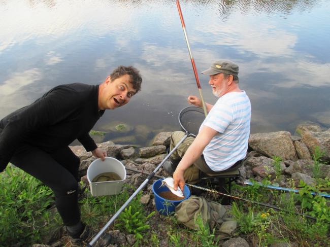 Luontokuvaaja ja kirjailija Pekka Tuuri otti Kimmoon yhteyttä viime talvena, ns. virka-apupyynnön merkeissä. Hän valmistelee seuraavaa luontokuvakirjaansa. Siinä ovat pääosassa suomalaiset kalat, kuvattuina omassa elementissään. Pekan kirjasta puuttui eräs laji, josta ei tiettävästi ole aiemmin vedenalaisia kuvia otettu. Kimmo toimi promoottorina ja kokosi lyhyellä varoituksella LP:n jäsenistä onkiporukan, jonka tavoitteena oli onkia miekkäsärki tai -särkiä kuvattavaksi. Pelkällä vapaiden kalojen sukelluskuvauksella kun olisi ollut lottoamistakin pienemmät onnistumismahdollisuudet Saimaan kanavan sameassa vedessä. Nelihenkinen onkiporukka kokoontui siis 19.6. kanavan rannalle, Suikinmyllyn läheisyyteen. Lahnahajusteilla terästettyä särkimäskiä kasteltiin kaksi paljullista ja onginta alkoi. Ensimmäinen tavoitekala pärski haavissa vajaan tunnin yrityksen jälkeen. Sen jälkeen kuvaaja puki sukellusvarusteet päälleen ja ensimmäinen kuvaussessio alkoi. Elävä miekkasärki rauhoitettiin vesiastiassa neilikkaöljyä apuna käyttäen. Sitten avustaja (Kimmo) laski hieman tokkuraisen kalan veteen kuvattavaksi. Hommassa tärkeimmiksi asioiksi osoittautuivat ajoitus, maltti sekä tuuri pienellä t-kirjaimella. Jo ennen kuin ensimmäisestä kalasta oli ns. tarpeeksi kuvia, se vapautettiin (huom. neilikkaöljy ei aiheuta kalalle vammoja tms.) koska "miekkoja" ilmaantui paikalle lisää ja toiminta uusien kalayksilöiden kanssa jatkui. Kaiken kaikkiaan niitä tuli kolmen tunnin aikana kuusi (Asko sai 3, Pasi yhden ja Samu 2, Kimmon jäädessä ilman tavoitekaloja) ja pari pääsi irti väsytysvaiheessa. Kaikki miekkasärjet tulivat pohjan läheisyydestä, seitsemän metrin vavoilla. Aikeemme onnistuivat yli odotusten, etenkin vieraamme mielestä. Hän kiteytti kvartetin toiminnan seuraavasti: "Ihmeellistä porukkaa, saavat onkimalla enemmän miekkasärkiä kuin muita kaloja!" Kuvassa tyytyväinen onkimies, miekkasärki ja yksi hurmioitunut luontokuvaaja. Lisää kuvia näet kun klikkaat "Lue lisää" Näet kuvan suurempana, kun klikkaat kuvan päällä.