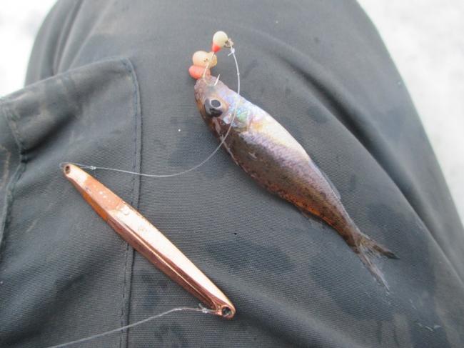 (Kuvassa päivän yleisin ja "miellyttävin" saaliskala, alle kymmenen gramman kiiski. Niitä nousi järvestä päivän mittaan satoja.)
